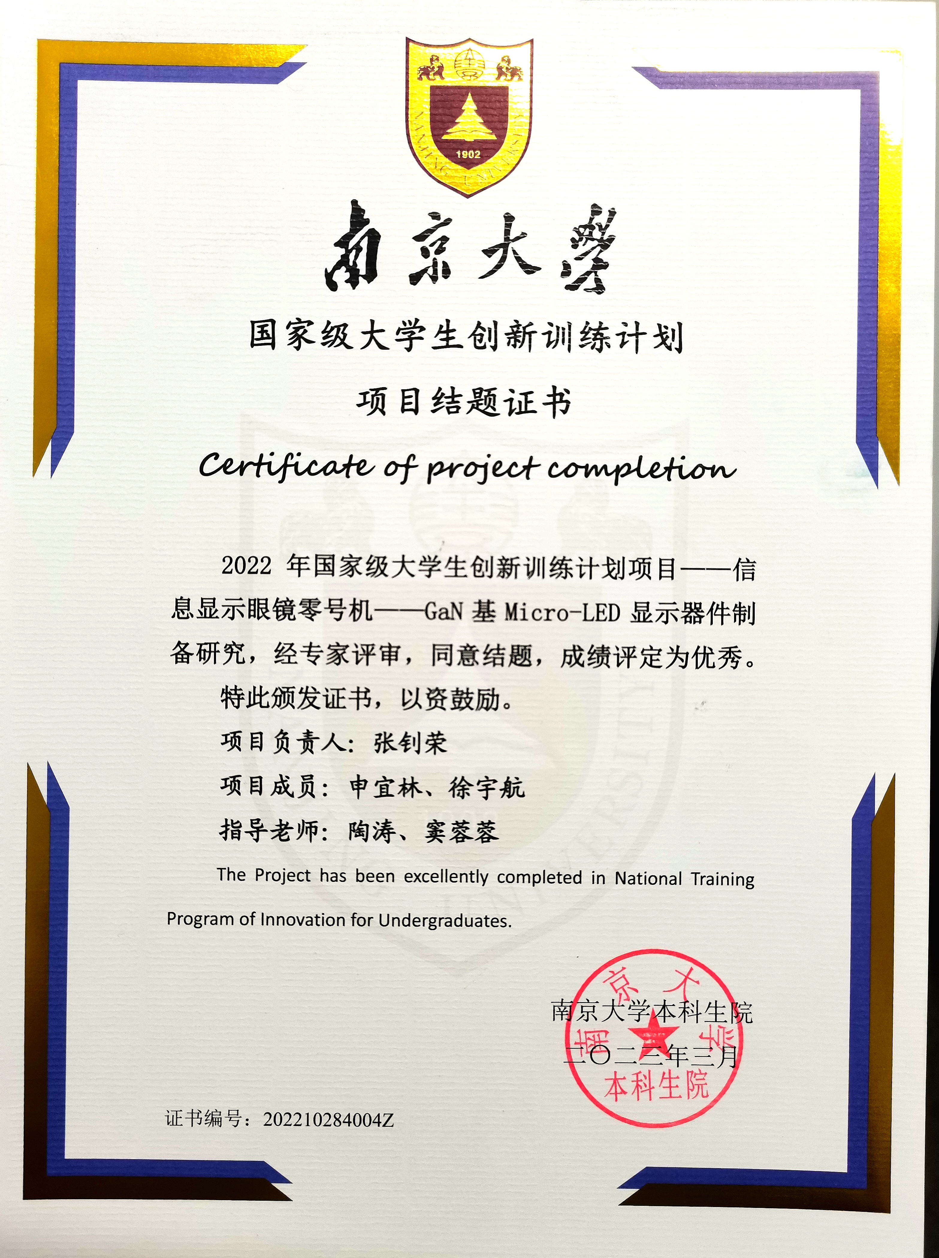 · Research achievement: apply for an invention patent: the method of preparing high-resolution nano-image element display array by using flexible nano-dwelling film; meanwhile, participate in the 2022 National Internet+ Competition based on this project and win the national gold medal.
